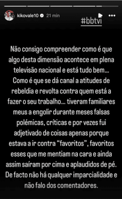 “De facto, não há qualquer imparcialidade e não estou a falar dos comentadores”, concluiu o ex-participante do BB2023.