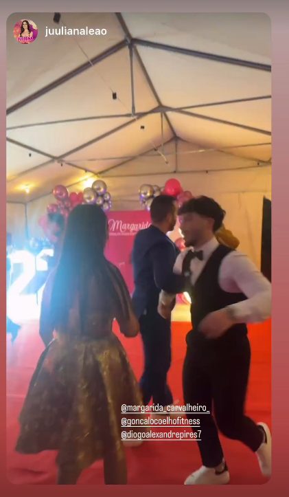 A surpresa começou com Gonçalo vendando os olhos de Margarida e mantendo o mistério até chegarem ao local da festa: uma quinta onde a celebração estava cuidadosamente preparada. Ao chegar, Margarida foi desvendada da venda e viu-se rodeada de uma decoração deslumbrante e um ambiente de festa única.