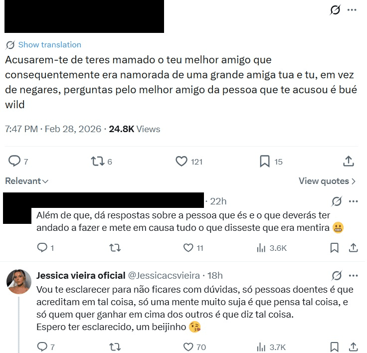 Tudo começou na rede social X, onde Catarina Miranda levantou dúvidas sobre a proximidade entre Jéssica Vieira e Marcelo Palma, insinuando comportamentos inadequados. A comentadora chegou mesmo a sugerir que a influenciadora teria procurado atenção junto do ex-namorado de uma amiga próxima, numa acusação que incendiou o debate entre seguidores.