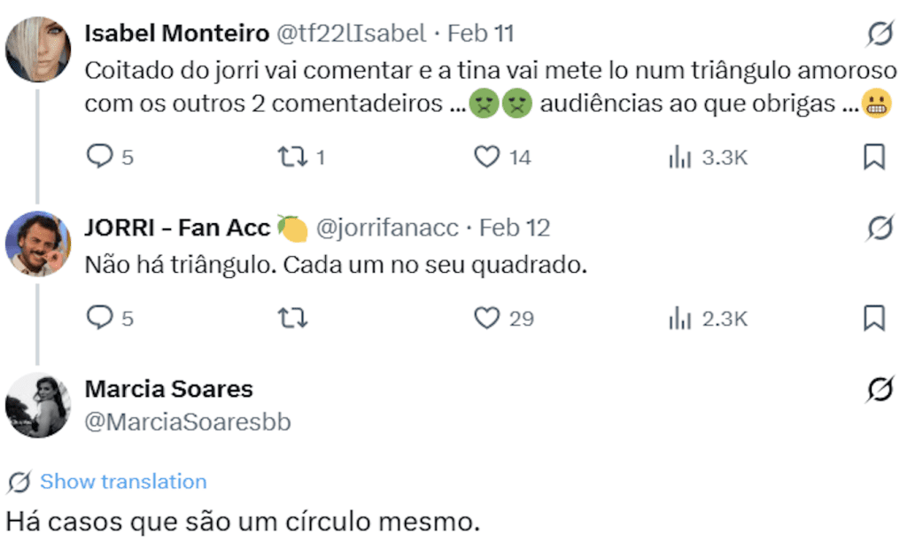 Durante a transmissão, um internauta lançou uma previsão bem-humorada sobre os comentadores da nova edição da Casa dos Segredos, sugerindo um possível “triângulo amoroso” envolvendo Márcia, Francisco e João Ricardo, conhecido como Jorri. A ‘brincadeira’ rapidamente chamou a atenção dos fãs, que aguardavam uma reação da ex-concorrente.