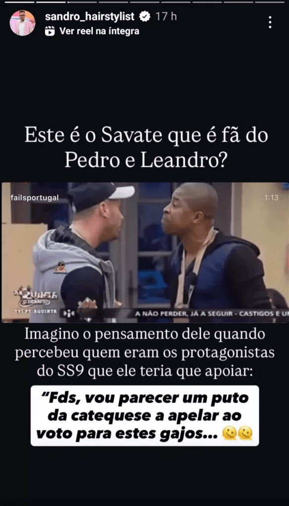 “Imagino o pensamento dele quando percebeu quem eram os protagonistas do SS9 que ele teria que apoiar. ‘Fds, vou parecer um puto da catequese a apelar ao voto por estes gajos’”, afirmou, deixando o comentário a gerar reações divididas entre os fãs.