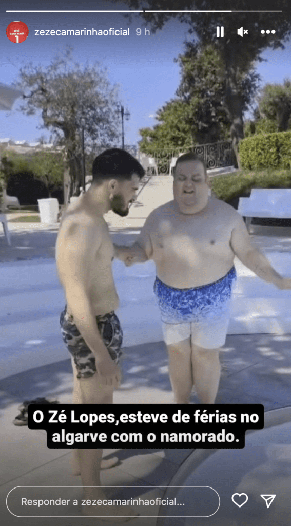 A partilha foi feita num story , na conta pessoal de Zezé Camarinha do Instagram, onde partilhou uma imagem com dois homens, sendo um mais gordinho, junto a uma piscina.